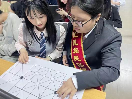 活动的第二个环节是围鹿棋的对弈环节,围鹿棋是达斡尔族的传统体育竞技项目之一,被列入内蒙古自治区非物质文化遗产名录。深受达斡尔族群众喜爱,具有广泛的群众基础。宣讲人先对围鹿棋的背景知识进行了简单的讲解,之后就是对围鹿棋对弈规则的介绍,通过文字和实际演示两种方式相结合的方式,让同学们更快的消化和理解,同学们也在认真听讲,积极回答问题。在规则介绍结束之后,自行寻找对手的开始了对弈环节,气氛活跃。